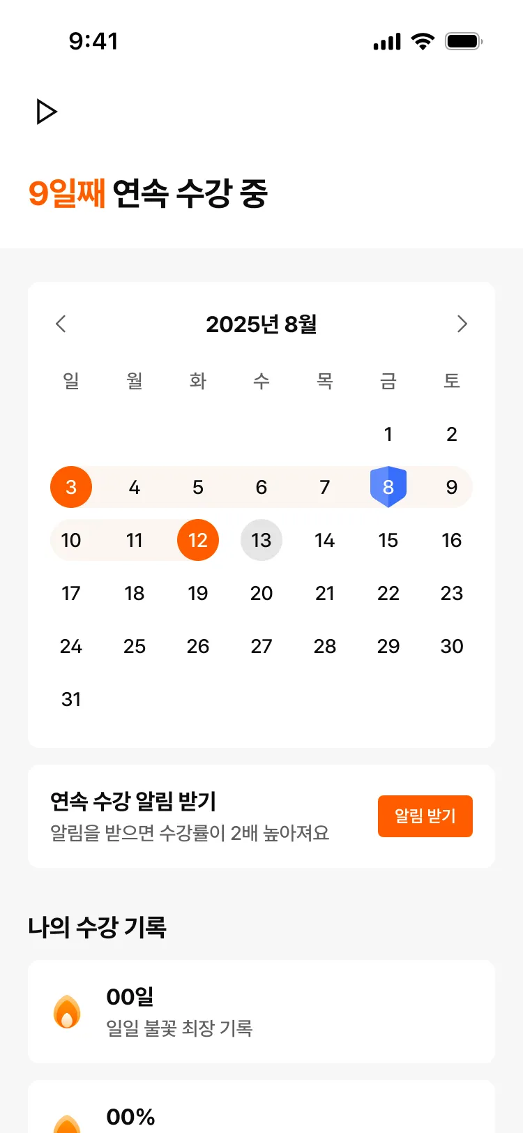 연속 수강으로 성취감을 느껴보세요.연속 수강으로 불꽃을 유지하고 성취감을 느껴보세요.